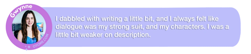 Gwynne: I think I stumbled upon the visual novel genre when I was a teenager and played a lot of games by a developer called Pacticist, and I think she was a solo female dev, quite young, doing a lot of dating sim-type visual novels. And I just really liked the genre. I played a lot of Voltage games as well, or rather I watched Let’s Plays of them on YouTube before they got copyright striked. And it just seemed very approachable.