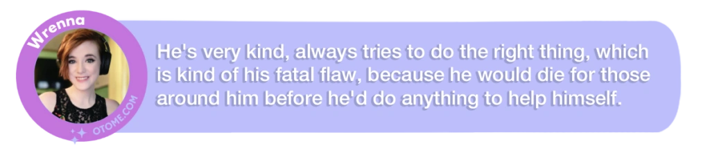 Wrenna: I would definitely say, hands down for me, Emrys is my baby. I definitely put elements of myself into each of the characters, but there’s something about him where It felt like, from day one, I was just pouring my soul onto the page, and his sense of humor and his good-hearted nature just always pulls me to him, even if all of his attempts at doing good things just fail hilariously. He’s got this charm about him that makes him very addicting for me.