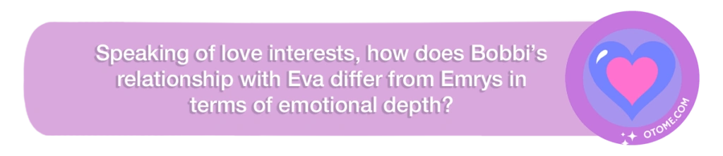 Wrenna: Bobby has known Eva for years. And at the start of the game, they’re already best friends who know everything about one another. And they’ve been through a lot of life together. And so they’re very bonded in a deep way, even before their romance can begin. Bobbi’s definitely the person that Eva can go to for anything, and she leans on Bobbi a lot when things get rough.