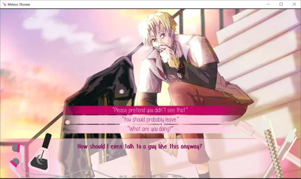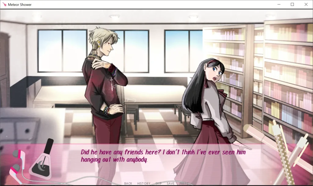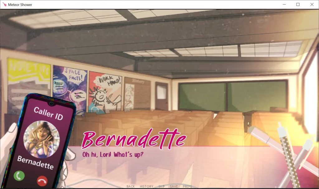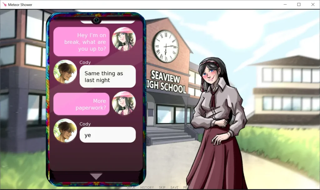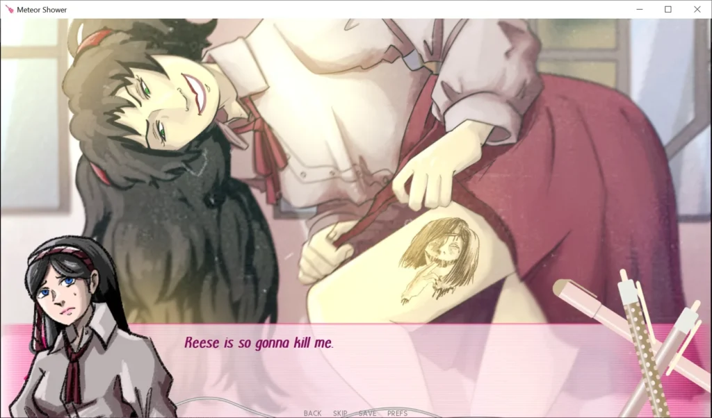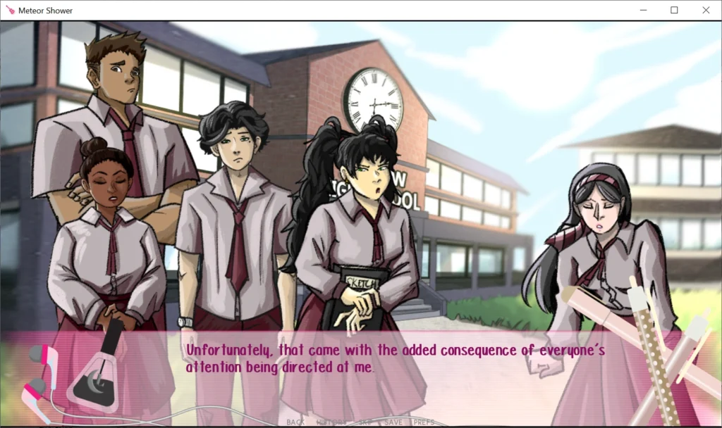 Skai: Hi, I’ve been here before, I’m Skai again, and this time I’m talking about a game that I made with my friends from high school actually, Jinn and Pyr. We grew up together, and it’s only fitting that we’d start off our game-making endeavors making a game that is set in high school. Meteor Shower is a little passion project that got out of hand, it was supposed to be our test run, but it became the foundation for the sequel we want to make later when these characters are adults. Right now, they’re kids, and we’re just living that nice youthful experience through them.