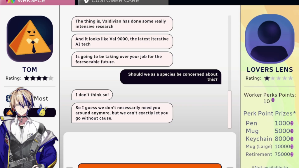 Just when we start to settle in, the company announces they’re replacing support staff with AI. Even our hyper-corporate manager Tom is being phased out and pretending it’s no big deal, which makes us wonder if he’s secretly part machine. We’re left in a weird state of “labor limbo” that’s funny, but also way too real.