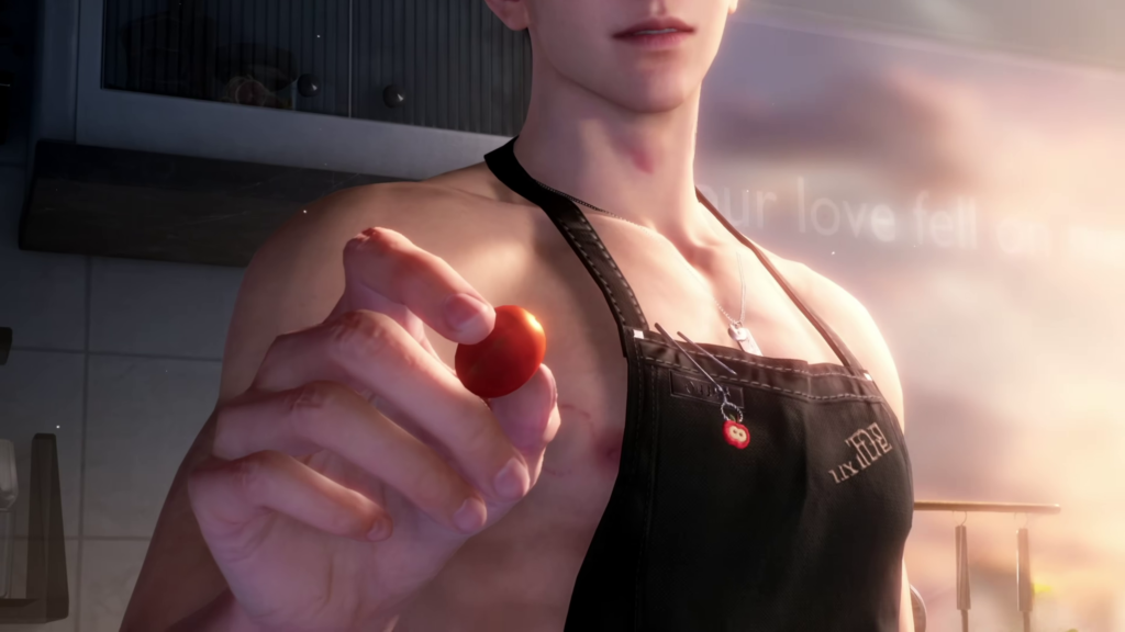 One major highlight is the sparkly banner art, featuring a comforting and possibly intimate scene. This scenario revolves around Caleb preparing a meal, wearing only an apron with vivid red tones. Observers pick up on the sleek details: references to a Staub cast-iron piece, the presence of fresh apples symbolizing Caleb’s motif, and the bright kitchen environment. The combination of warm lighting and domestic vibes emphasizes the strong bond between the MC and Caleb.