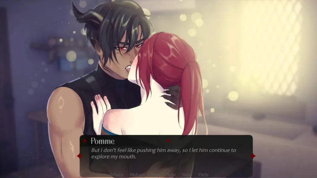 In this Dartk Fantasy otome game, we find ourselves in a peculiar situation. We are half and half forced and willing to be hostage to a horned man who replenishes his energy by doing increasingly more intimate things to us.